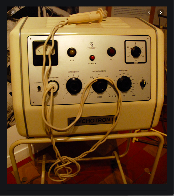 Ik herinner me nog het korte overleg vlak voor de behandeling met behulp van het elektroshock apparaat. Hoofd afdeling overlegt met de arts over de intentie van de shock. ‘Doe maar: …..’ waarna zo’n beetje ‘uit de losse pols’ het apparaat wordt ingesteld.