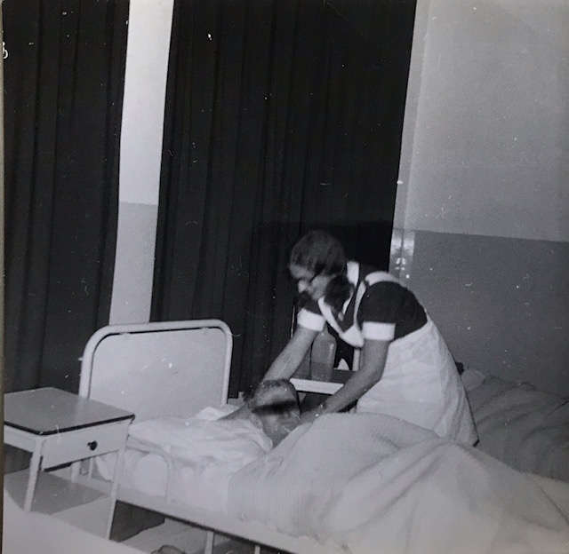Of je het wilt of niet, als je een boek schrijft over je eigen verleden, herinner je je ook allerlei dingen die allang in de vergetelheid geraakt waren. Zo herinner ik me weer van alles en ga op zoek naar foto’s waarvan ik weet dat ik ze nog heb, ergens. Het is wel zoeken hoor! Maar natuurlijk vind ik er een paar. Als tweedejaars zuster werk ik hier op een mannenafdeling en zit in de nachtdienst.