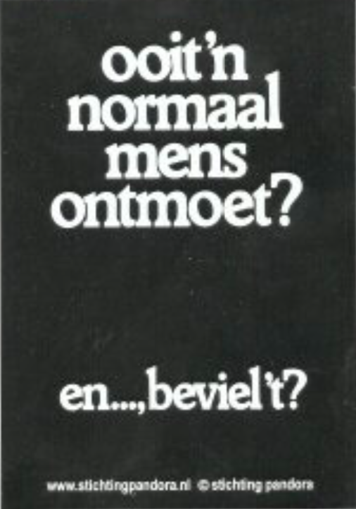 In de jaren zeventig kon je overal -en met name in de psychiatrie- deze poster zien hangen. Hij kwam bij de Stichting Pandora vandaan. Deze Stichting werd gerund door o.a. ervaringsdeskundigen om mensen met psychische problematiek bij te staan.